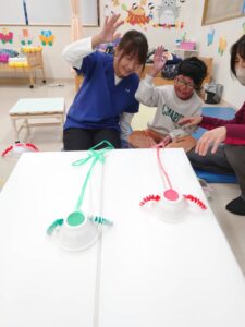 2チームに分かれて駒を進めながら得点を集め、止まったマスに書いてあるお題を頑張って実行しました。