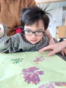 お花畑の花は、ビニール袋に絵の具をつけてポンポンとスタンプしました。